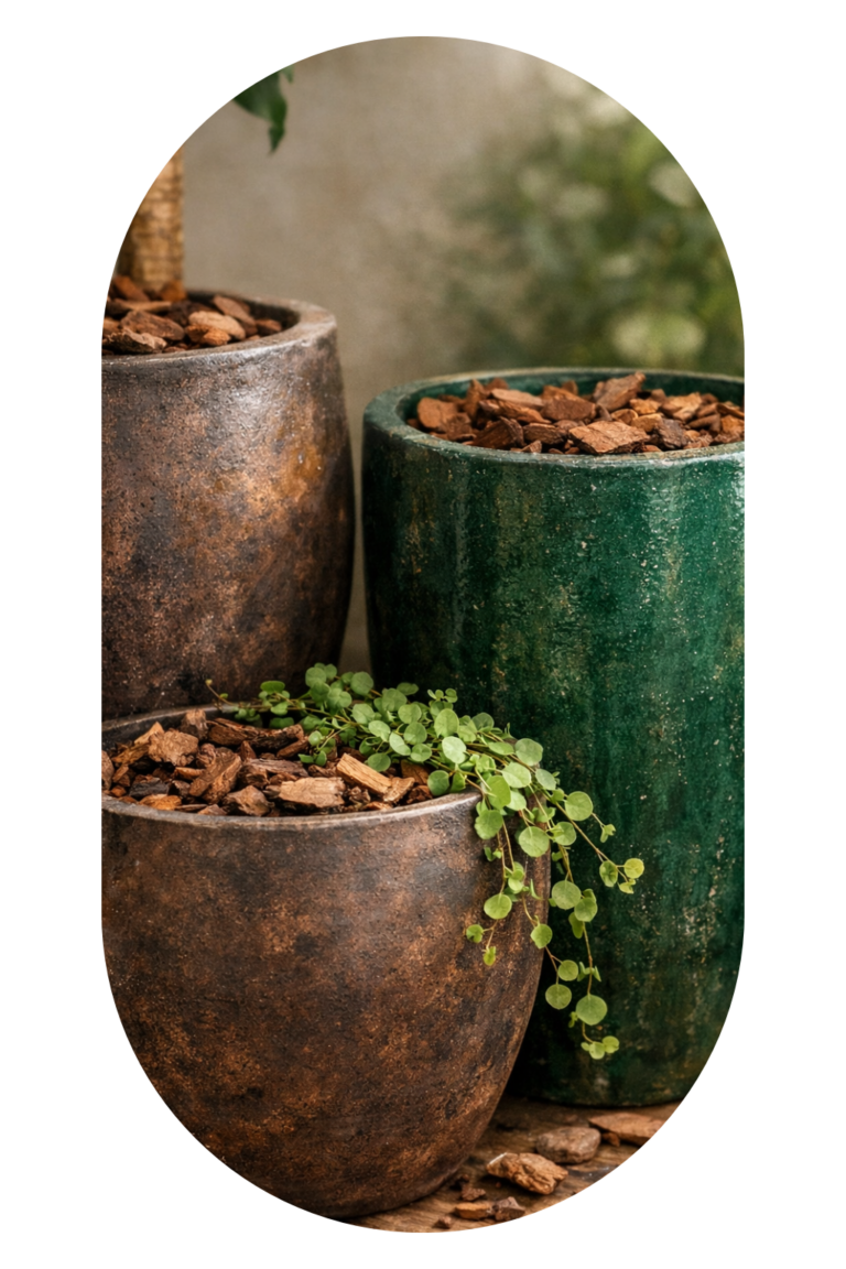 Composição de Vasos – Mansão Wildberger 3 Elegância natural em detalhes que fazem a diferença Em mais uma parceria com o escritório DB Arquitetos, a Galpão 5 desenvolveu uma composição