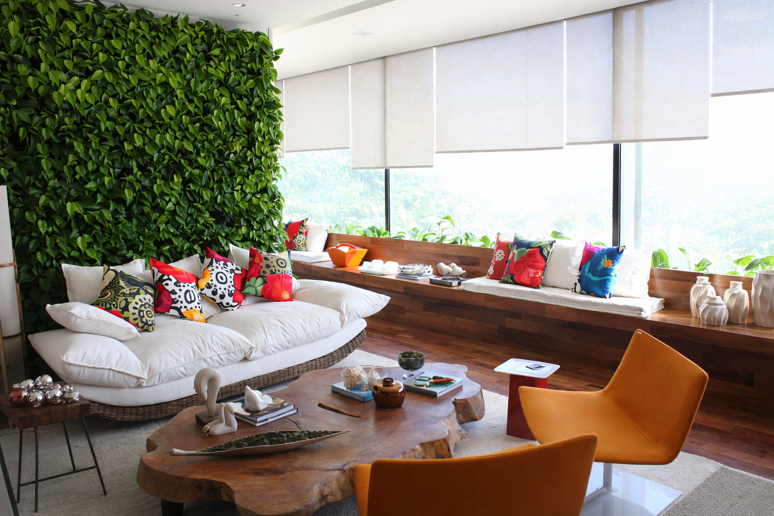 Durante a Mostra Casa Cor, a Galpão 5 foi responsável pela execução de um jardim vertical natural no ambiente assinado pelas arquitetas Carolina Quintela e Carolina Bittencourt. Instalado em um living alegre e humanizado, o jardim trouxe um toque de natureza que reforça o espírito acolhedor do espaço. Com um desenho leve e bem integrado à composição do ambiente, o jardim vertical trouxe vida, movimento e textura, ilustrando perfeitamente como esse tipo de solução pode se adaptar a espaços residenciais contemporâneos. A vegetação foi cuidadosamente selecionada para criar uma paleta verde vibrante, acompanhando o clima descontraído e sensorial do projeto.