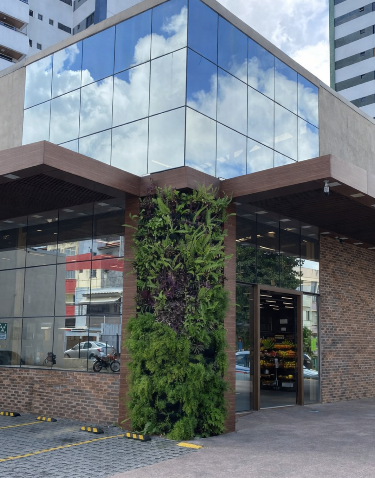 Implementamos jardins verticais naturais nas áreas externas das unidades, criando fachadas vivas que transformam o cenário urbano. Essa iniciativa reafirma nosso compromisso com a sustentabilidade e o bem-estar: as plantas atuam como um pulmão verde, melhorando a qualidade do ar e o conforto térmico. Assim, proporcionamos uma experiência de compra mais leve e autêntica, conectando nossos clientes à vida em sua forma mais pura e inovadora.