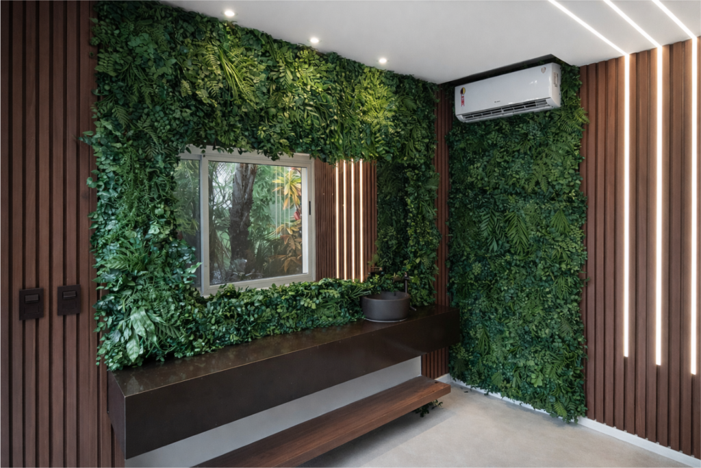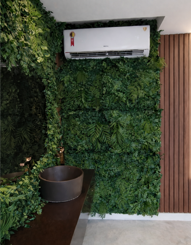 A composição foi cuidadosamente para criar uma profundidade visual que enriquece o espaço com diferentes texturas. A presença do jardim vertical contribui para uma atmosfera sensorial completa, onde o verde atua como elemento calmante, promovendo equilíbrio, bem-estar e conforto emocional.