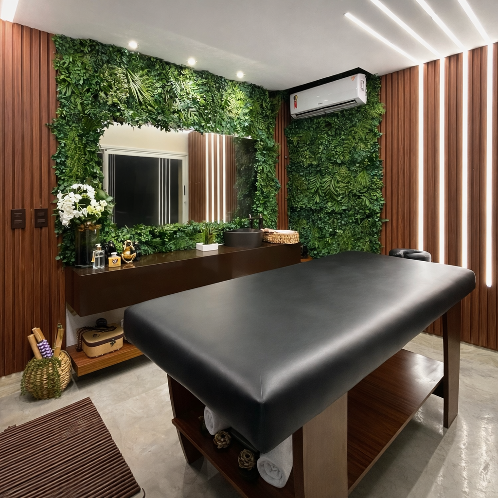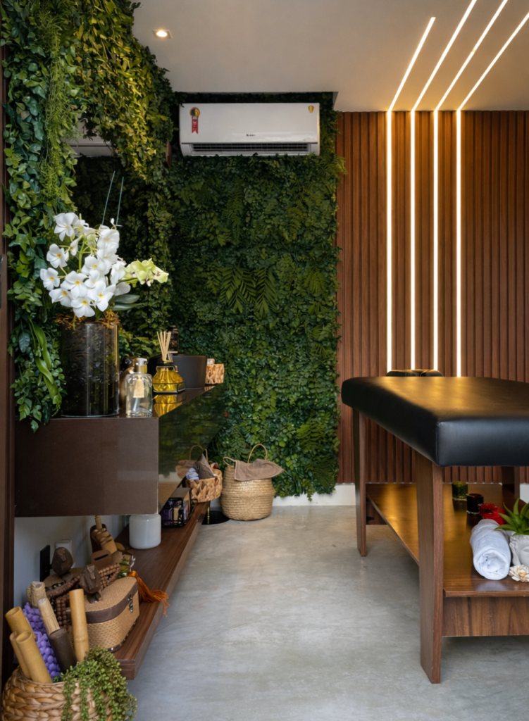 Pensado para ser mais do que um elemento decorativo, o jardim vertical foi idealizado como parte essencial da atmosfera do spa. Instalado estrategicamente no ambiente, ele estabelece um diálogo sutil e elegante com a vegetação viva do entorno, criando continuidade visual e ampliando a sensação de imersão. O resultado é um cenário onde interior e exterior se complementam, dissolvendo limites e fortalecendo a percepção de acolhimento e tranquilidade.