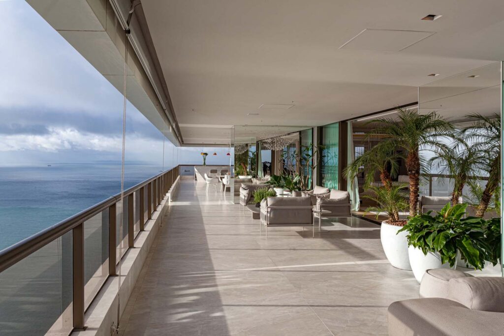 A seleção das espécies vegetais e dos recipientes foi pautada por um rigoroso equilíbrio entre formas, texturas e cores, buscando uma harmonia perfeita com os materiais nobres e os acabamentos da residência. A escolha de cada planta levou em conta o volume necessário para preencher o espaço com leveza e naturalidade, sem comprometer a fluidez do tráfego ou a visibilidade dos detalhes arquitetônicos. Esse cuidado na composição permite que a natureza se integre de forma orgânica ao cotidiano, proporcionando frescor e uma sensação imediata de bem-estar.