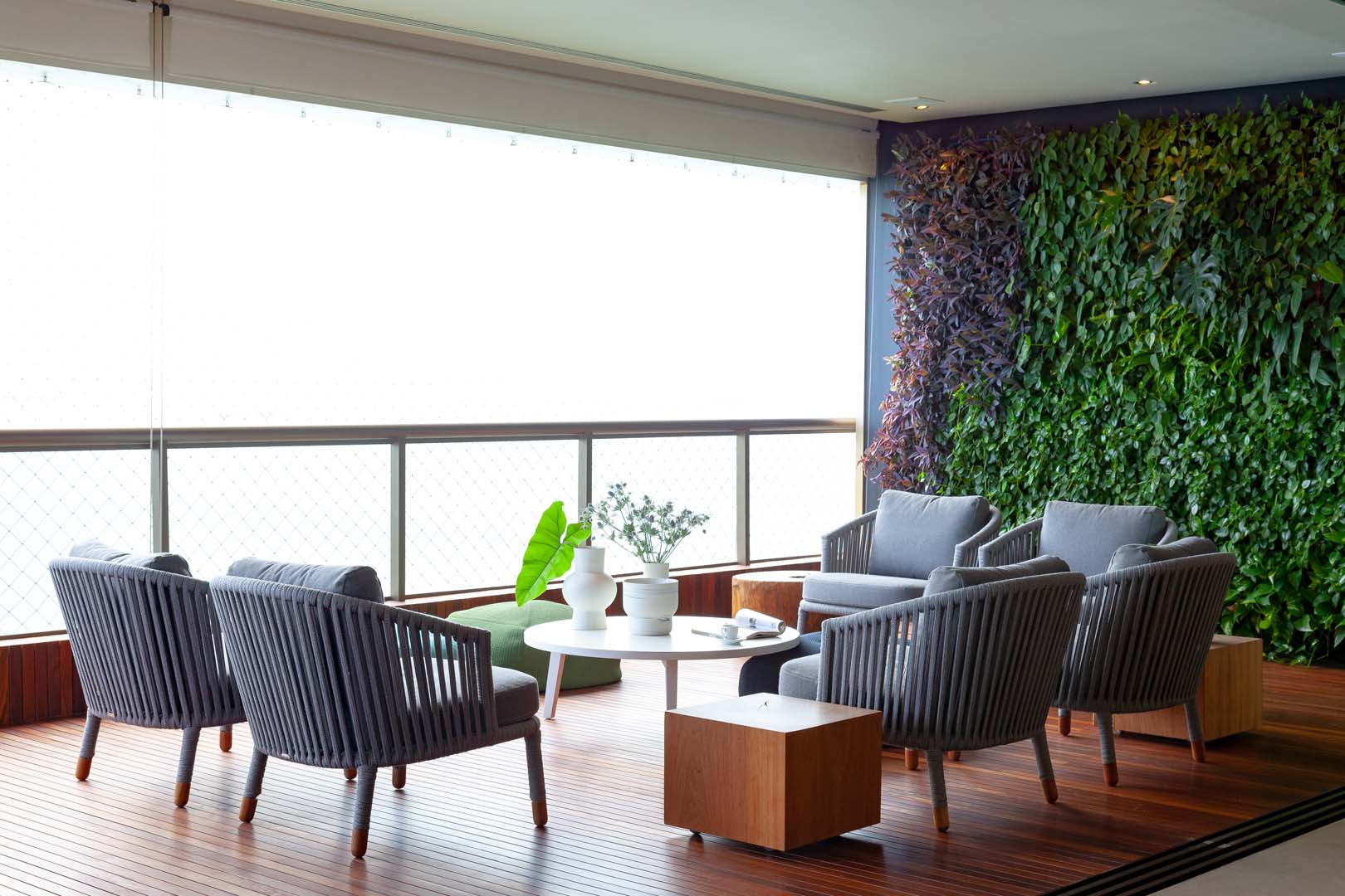 A execução técnica deste painel verde envolveu uma curadoria botânica rigorosa, onde a escolha das espécies naturais transcendeu a beleza ornamental. Cada planta foi selecionada com base em sua adaptabilidade às condições específicas de microclima e luminosidade do local, assegurando que o jardim mantenha seu vigor e sua paleta de cores de maneira duradoura. Além disso, a composição foi planejada para se alinhar perfeitamente à rotina dos moradores, utilizando sistemas de manutenção e irrigação que garantem a perenidade do ecossistema com máxima eficiência. O resultado é um arranjo rico em texturas e volumetrias, que introduz uma dinâmica de movimento e frescor capaz de transformar a percepção sensorial de todo o ambiente.
