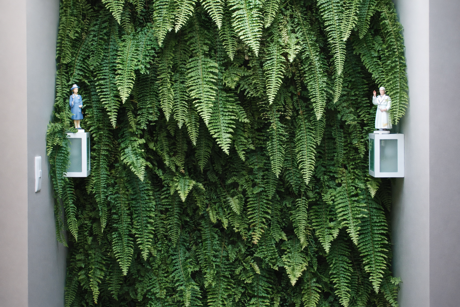 A escolha das samambaias como protagonistas desta composição foi pautada por sua volumetria exuberante e pelo movimento fluido de suas folhagens, características que conferem uma sensação imediata de frescor e leveza ao ambiente. Ao preencher o espaço com essa densidade verde, o jardim atua como um elemento de humanização que suaviza as linhas rígidas da arquitetura corporativa sem obstruir a funcionalidade ou a circulação. Esta parede viva não apenas decora, mas interage silenciosamente com as pessoas, funcionando como um dispositivo de bem-estar que oferece um respiro mental constante, reduzindo o estresse e elevando a qualidade do ambiente de trabalho de forma sutil e onipresente.