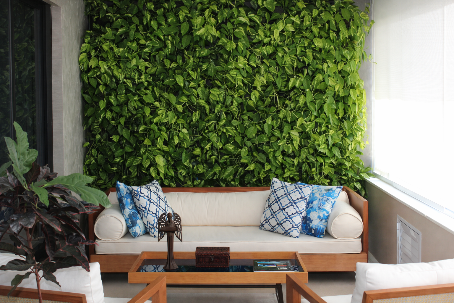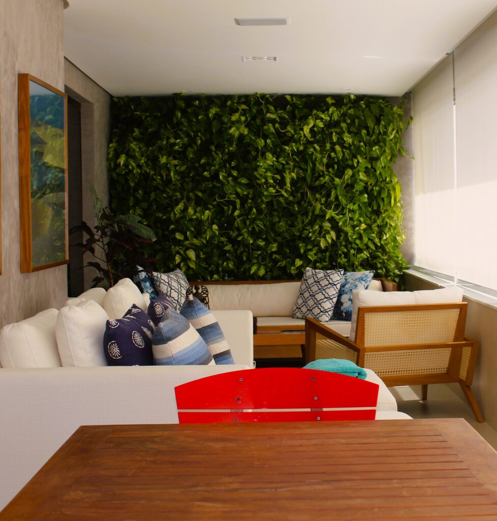 Este projeto em uma cobertura em Salvador ilustra com perfeição a competência da Galpão 5 em desafiar as limitações geográficas para criar refúgios particulares de alta sofisticação. A intervenção consistiu na implementação de um jardim vertical natural em uma varanda gourmet que, estrategicamente abrigada das correntes de vento intensas típicas das áreas elevadas da cidade, permitiu a transição fluida de uma área originalmente externa para um ambiente interno de convivência e acolhimento. A proposta foi desenhada para atender ao desejo genuíno dos moradores de “trazer o jardim para dentro”, convertendo o espaço de lazer em um ecossistema privativo que preserva o frescor e a leveza da natureza em meio ao cenário urbano verticalizado.