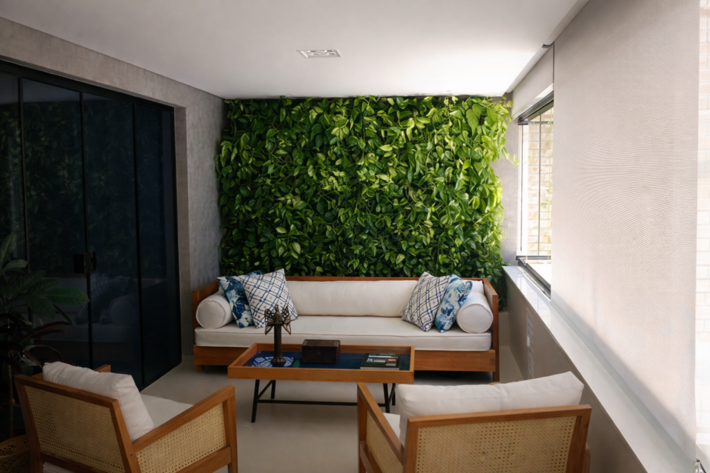 O jardim vertical atua como um pano de fundo vivo e sensorial, conferindo uma profundidade visual que amplia a percepção espacial da varanda. Mais do que uma solução decorativa, a parede verde estabelece uma conexão biofílica imediata, transformando momentos de descanso, refeições e encontros sociais em experiências imersivas. A curadoria botânica foi desenvolvida com rigor técnico, selecionando espécies que florescem com vigor nas condições específicas de luminosidade e ventilação controlada do ambiente. Essa precisão na escolha garante que a exuberância das plantas se mantenha